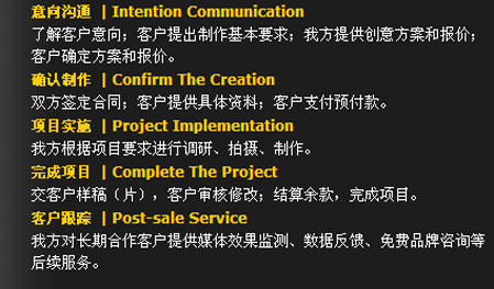 意向溝通 | Intention Communication 十年磨一劍,經(jīng)典影視已經(jīng)成為業(yè)內(nèi)規(guī)模化品牌傳播專業(yè)機構(gòu)。   思想力——Idea Create Value! 品牌傳播相信:只有與眾不同的創(chuàng)意,才能為客戶創(chuàng)造價值!出色的藝術(shù)是創(chuàng)意品牌的保證;我們是客戶的伙伴,我們并肩作戰(zhàn),只為創(chuàng)造一個偉大的品牌。   智慧力——創(chuàng)作團隊 創(chuàng)意總監(jiān)——創(chuàng)意來自生活,高于生活 美術(shù)指導(dǎo)——身手敏捷,思想敏銳,具有獨特的美術(shù)嗅覺 資深策劃——思維縝密而又膽識過人,常常給人意外之喜 經(jīng)典影視.品牌傳播,采用國際化的Team作業(yè)模式——   保證力——作業(yè)流程 我們一直相信,只有科學(xué)、規(guī)范的作業(yè)流程作為運作保障,優(yōu)秀的創(chuàng)意才能得以完美的實施。在經(jīng)典影視,我們一直秉承——策略精準 . 創(chuàng)意新銳 . 執(zhí)行出色。